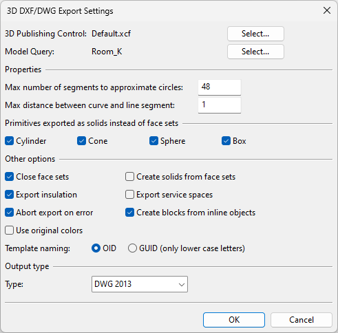 In the 3D DXF/DWG Export Settings dialog, you can specify settings for exporting 3D model objects in DXF or DWG format.