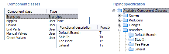 In the picture below, the "Branches" component class has the functional codes "Default Branch", "Stub In", "Tee Piece" and "Lateral", which are then listed in the corresponding "Branches" folder of the Piping Specification.