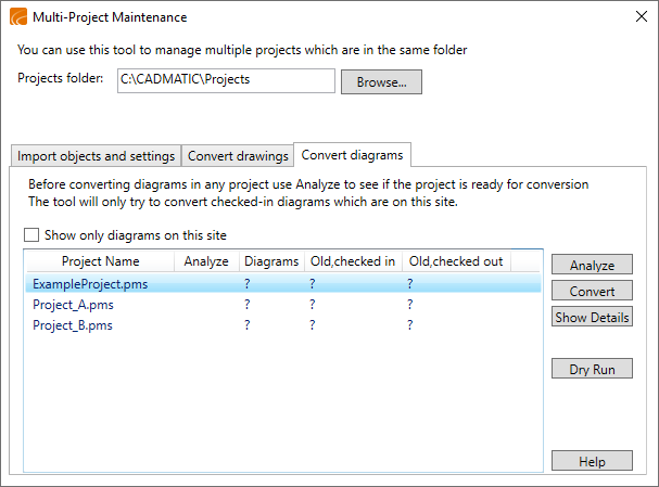 Open the Convert diagrams tab. The project list pane lists all the projects found in the selected project folder.