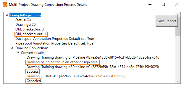 To show a report on the current status of projects that you have analyzed or converted, select the projects from the list and click Show Details. The Multi-Project Conversion: Process Details dialog opens, and you can expand a project-specific node to see the information that it contains. In the report you can see, for example, that the analysis failed because you have no workspace in the project or that a specific document conversion failed because the document is checked out. You can save the report as a CSV file by clicking Save Report.