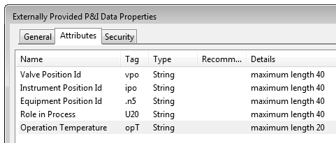 The attributes assigned to the Externally Provided P&I Data COS object type are the attributes that used in the integration. The attributes specified here are published to COS by P&ID. The position ID attributes Valve Position Id, Instrument Position Id and Equipment Position Id are automatically part of the integration in new projects. Very old projects might need to be configured manually.