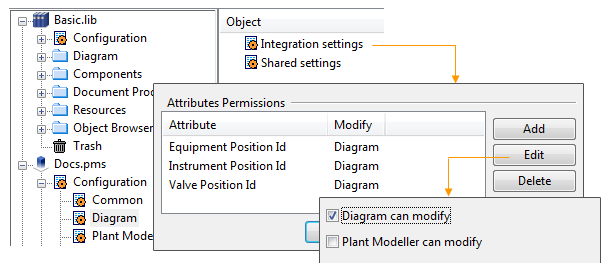 There is a configuration object in the project folder Configuration > Diagram > Integration settings which can be used to specify what attributes are allowed to be modified in Plant Modeller and/or in P&ID. Currently only "modify" permissions are handled here. In default configuration everything can be modified by both sides except position IDs of integrated objects which can only be changed by P&ID.
