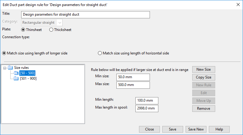 For each size range, you can specify the minimum length and maximum length in the spool separately. It is possible to have more than one entry in the specification for these design rules. Normally, one is enough, though, because one rule can contain different rules for different sizes.