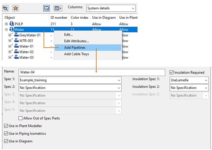 Note: If the pipeline is to be used in the P&ID application, the name cannot be the same as the name of its System.