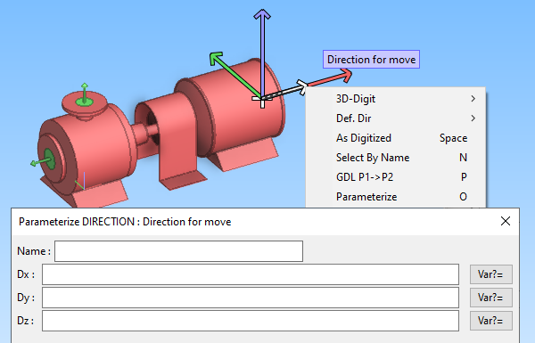 Parallel to X, Y, Z – You are prompted to select the objects and the distance to move. Distance can be given with a parameter.