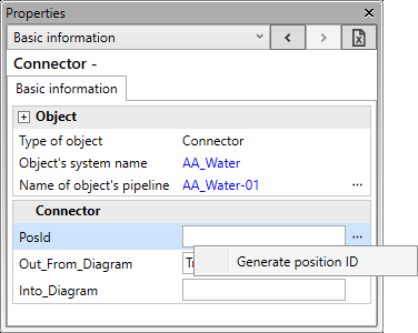 Assign a position ID to the free connector: select the connector in the diagram, open the Properties pane, and type a position ID in the PosId field or generate one from … > Generate position ID.