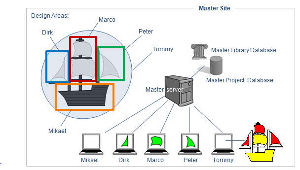 In the picture above, Dirk, Marco and Peter have each checked out a sail to modify it. Using the command Object coloring style > By owner (Alt+5), each designer can see the ownership status of all the objects in their design area.