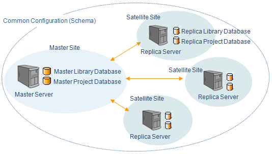 The actual design work takes place at a project site (master site or satellite site). A project site consists of a number of computers connected by a LAN. There is a COS server (master server or replica server) that hosts the project and library databases, and there is a shared directory that can be accessed by all the computers that participate in the project at this site.