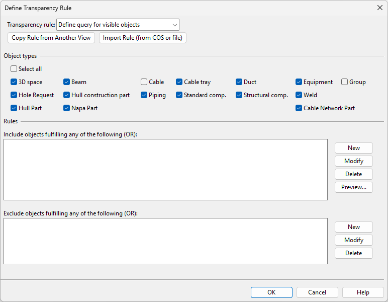 Use the query editor to define a query that selects the objects that you want to see as transparent in the views, as described in Query editor, or use the Copy Rule from Another View or Import Rule (from COS or file) functions to apply an existing query.