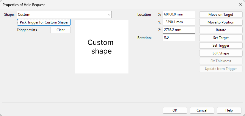 In the Hole Management options, the project administrator can enable the use of custom shape types. When enabled, the Shape drop-down list of the Properties of Hole Request dialog includes an additional hole shape: Custom. Selecting this shape type hides the dimension fields and displays the Pick Trigger for Custom Shape button. Using this button, you can select a model object that intersects with the target plate, to be used as the trigger object.