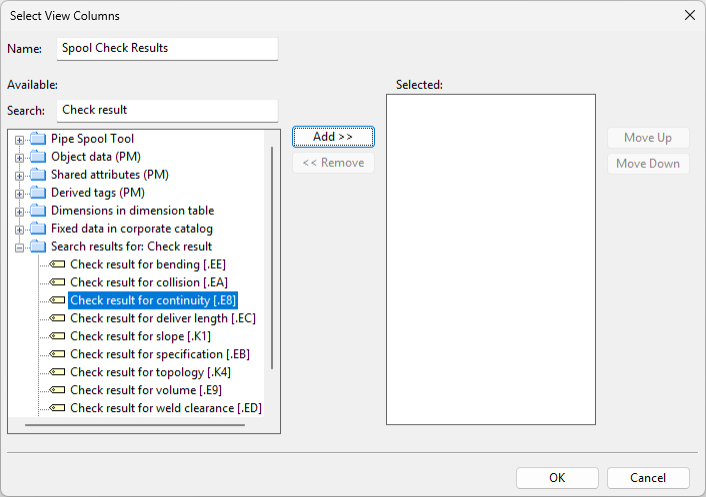 For example, to be able to view spool check results from the Spool List dialog, you can create a new column layout by the name 'Spool Check Results' and add the related columns from Object data (PM) > Piping to the Selected pane: