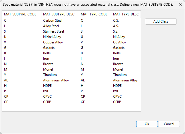 You can either cancel this dialog and modify the piping specification or create a new material class as follows: