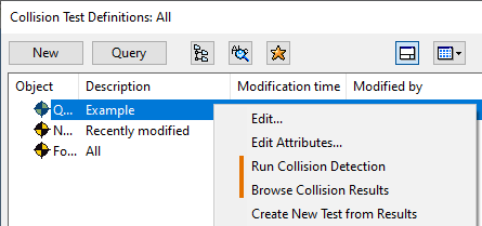 On the Tools tab, in the Manage group, select Collisions > Collisions. The Collision Test Definitions dialog opens.