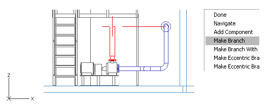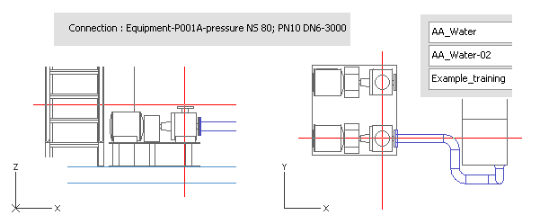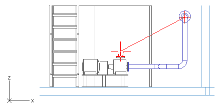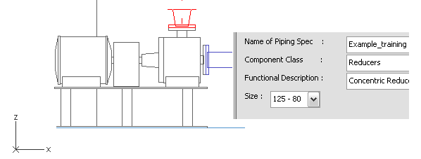 In this exercise, you start routing from the top connection, the pressure connection, of the pump. The first pipe segment after the flange is a reducer. Then, you route the pipe parallel to the Z axis at the level of the run pipe (which you routed in the previous exercise). The last step is to connect the new pipe with the run pipe using a branch.