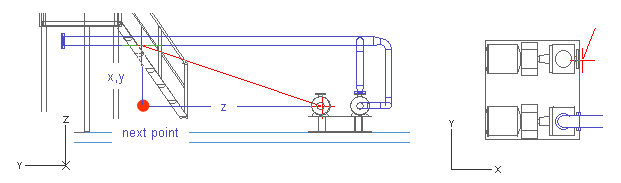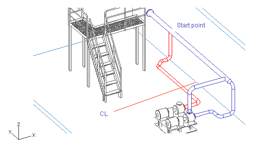 In this exercise, you start the pipeline from the run pipe with a branch and end it at the pump suction connection. You learn how to locate the start point by means of the plane CL (Y coordinate) and a connection point (X and Z coordinate) of the run pipe.