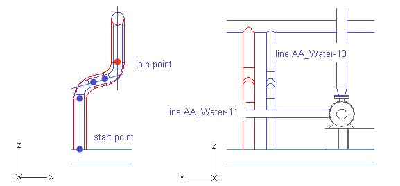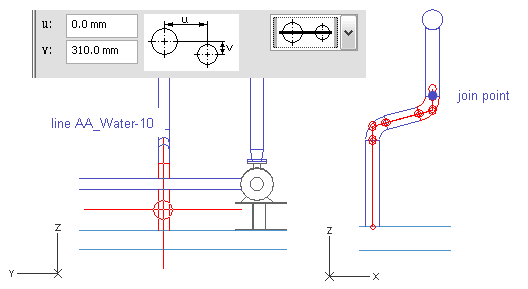 This pipeline starts at the tank top and follows the pipeline AA_Water-10 at five geometry points. This time the new pipe follows the centerline of the pipeline AA_Water-10 (distance u=0), but you could align pipelines according to their circumferences. Stop the routing at the fifth point and start routing a new pipe at the join point to get a branch into the run pipe.